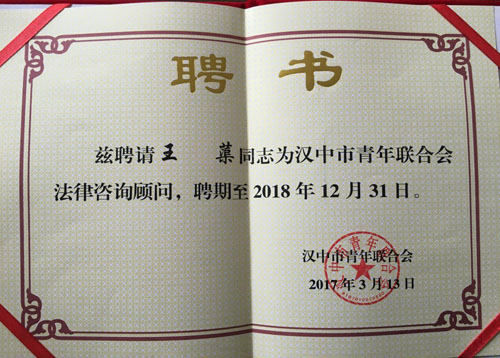 为了有效防范汉中市青年联合会会员在各类活动中的法律风险,营造良好的法治环境,推进青联各项事业蓬勃发展。共青团汉中市委、汉中市青年联合会联合汉中市司法局、汉中市律师协会经过甄选、决定聘请陕西嘉盟律师事务所王蕖、景兰江、陈晓兰三位律师为汉中市青年联合会法律服务中心的法律顾问,为汉中市青联会员提供法律服务。