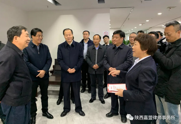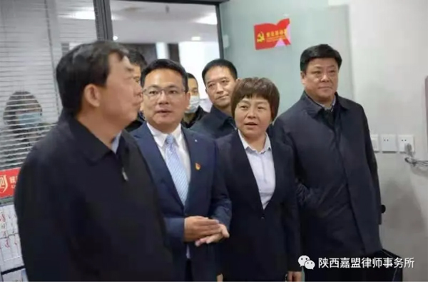 2020年12月2日下午,司法部党组成员、副部长、全国律师行业党委书记熊选国一行到陕西嘉盟律师事务所视察调研党建工作。中央依法治国办秘书局副局长顾延海、中华全国律师协会秘书长田昕、中央依法治国办秘书局信息处副处长王东升、司法部律师工作局律师业务指导处副处长宗源、省政府副秘书长吴聪聪、司法厅长王永明、副厅长李艾平、省律师协会会长韩永安等人陪同调研。