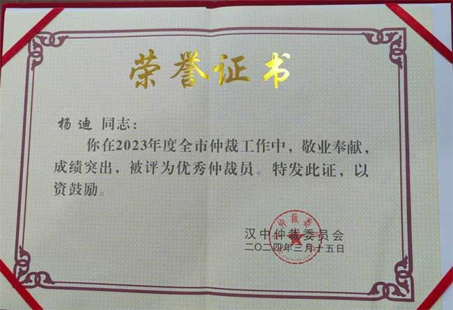 杨迪律师从2011年被选聘为汉中仲裁委仲裁员后,积极宣传推广仲裁制度,多次促成发生合同争议的双方当事人达成仲裁协议。杨迪律师始终恪守仲裁员的各项规范,对每一个仲裁案件都持以严谨细致的态度,做到秉持公心公正裁决,用实际行动展现了仲裁员应有的责任与担当。展望未来,杨迪律师继续坚守初心和使命,秉承人民律师为人民服务的宗旨,以荣誉为激励,再接再厉、勤勉履责,为汉中仲裁事业的发展贡献自己的力量。